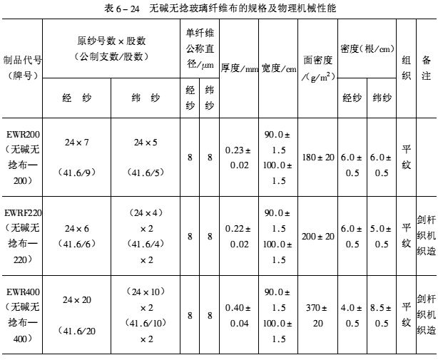 防腐蚀工程中最常用的是玻璃纤维布、玻璃纤维表面毡和玻璃纤维短切毡,用于氢氟酸等含氟工程时,采用无纺涤纶布、毡和丙纶布、毡。玻璃纤维布宜采用无碱(中碱)无捻粗纱玻璃纤维方格布,其厚度宜为0.2~0.4mm,经纬密度宜为每平方厘米4×4~8×8纱根数,规格及物理机械性能见表6-24和表6-25。玻璃纤维毡包括:玻璃纤维短切毡、玻璃纤维表面毡。玻璃纤维短切毡是由长度50~70m的短切纤维不规则粘结而成。玻璃纤维表面毡是用粘结剂将定长纤维随机地均匀铺放后粘结成毡,其厚度约为0.3~0.4mm,主要用于手糊成型制品表面。使制品表面光滑,且树脂含量较高,耐老化和耐腐蚀性能较好。耐腐蚀增强塑料的富树脂层一般均用表面毡片,其树脂含量可高达85%以上,有E和C玻璃纤维两种。